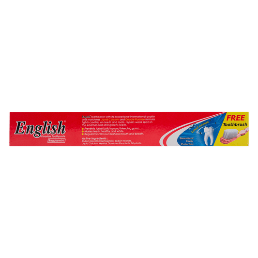 English Toothpaste offers a special range of toothpastes made up of rich calcium flouride and with natural ingredients which helps to reduce cavities, removes stain, prevent tarter and control plaque, also effective to tooth sensitivity and protect from bacteria all day. Additionally, it helps to keep your teeth strong, healthy, frehs and shining all day long. Under the Brand English offers complete oral care products for a healthy smile. Order ranges of English Toothpastes in Karachi or across Pakistan and Save your teeth from cavities, enamel erosion and sensitivity Today!Soda White
